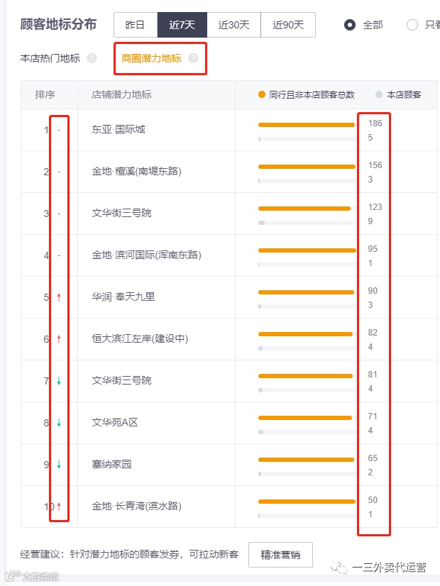 挑选地标时候可以选择有上升趋势的进行发券,同时也可以在那些下降的地标进行发券,意义在于在此地域进行顾客唤回以及拉新。
