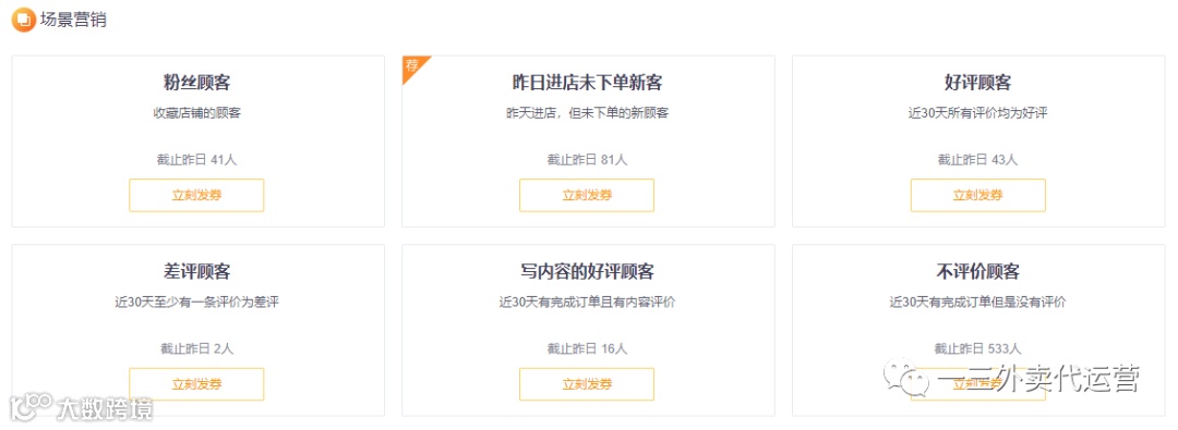 所谓场景营销是根据不同的场景进行精准营销,共分为6个场景分别是:;粉丝顾客、昨日进店未下单的新客、好评顾客、差评顾客、不评价顾客。
