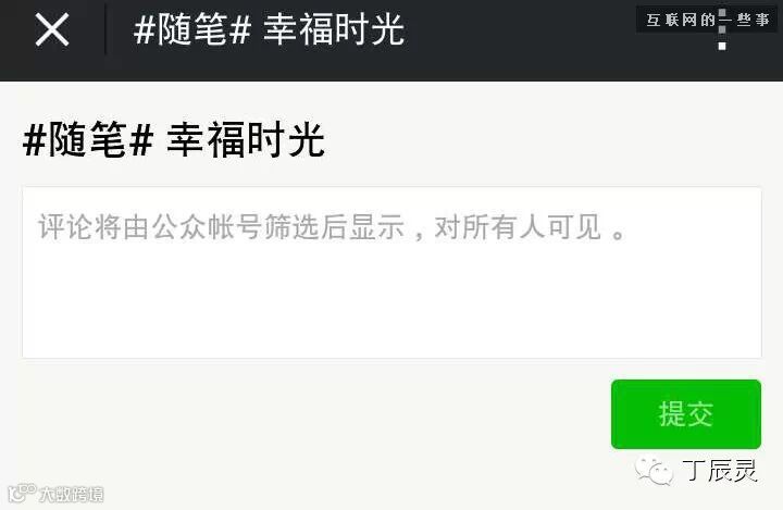目前,内测的评论板块是在图文消息的尾部,只有粉丝才有权限对该账号的内容进行评论,与此同时用户的评论是要在公众账号的筛选(审核)之下才能被显示在评论区,对所有人可见。这里的评论者之间无法产生任何的联系,同时每一条评论是单独而存在着。我们只能看见的头像、昵称、与评论内容,却做不了任何操作。