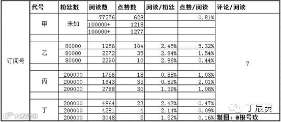 因为目前绝大多数微信公众账号(订阅号)的后台数据都是十分低。来吧,看看如上图片。这里选择甲乙丙丁四个账号,除去甲账号粉丝未知之外,乙丙丁分别为真实粉丝8万、20万、20万。然后随机统计了每个账号超过24小时的3条图文消息的阅读数与点赞数量。