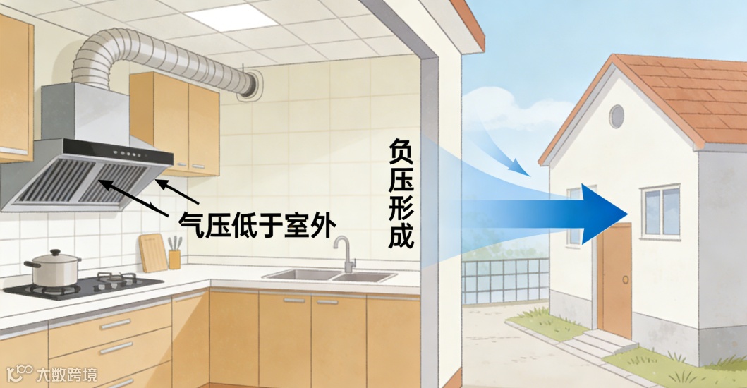 冬天门窗紧闭,厨房成了密闭空间。大吸力油烟机(排风量≥18m³/min)持续向外排烟,新鲜空气无法及时补充,导致厨房内气压低于外界,形成“负压”,实测可达-5~-15帕,堪比小型吸尘器。