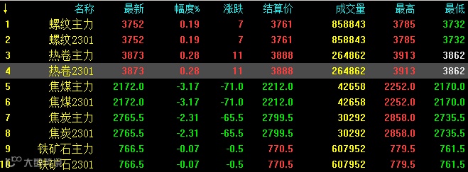 1日螺纹钢主力涨7,收报3752,涨幅0.19%;热卷主力涨11,收报3873,涨幅0.28%;焦煤主力跌71,收报2172,跌幅3.17%;焦炭主力跌65.5,收报2765.5,跌幅2.31%;铁矿石跌0.5,收报766.5,跌幅0.07%。