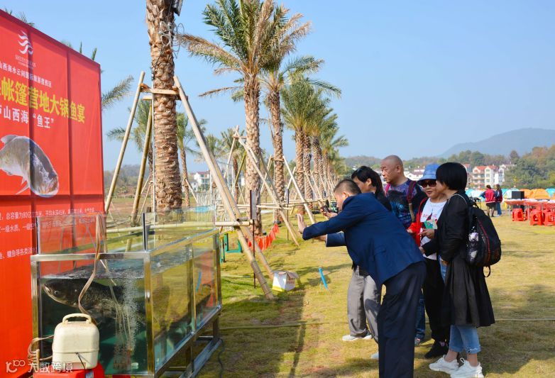 宾客们一来到水云间帐篷营地,就被一面墙的鱼缸深深吸引,里面是3条每条大约30多斤的“西海鱼王”和“鱼后”。