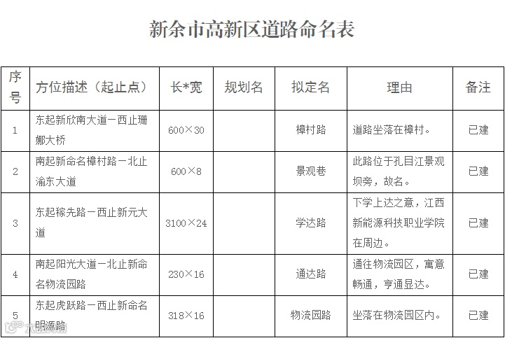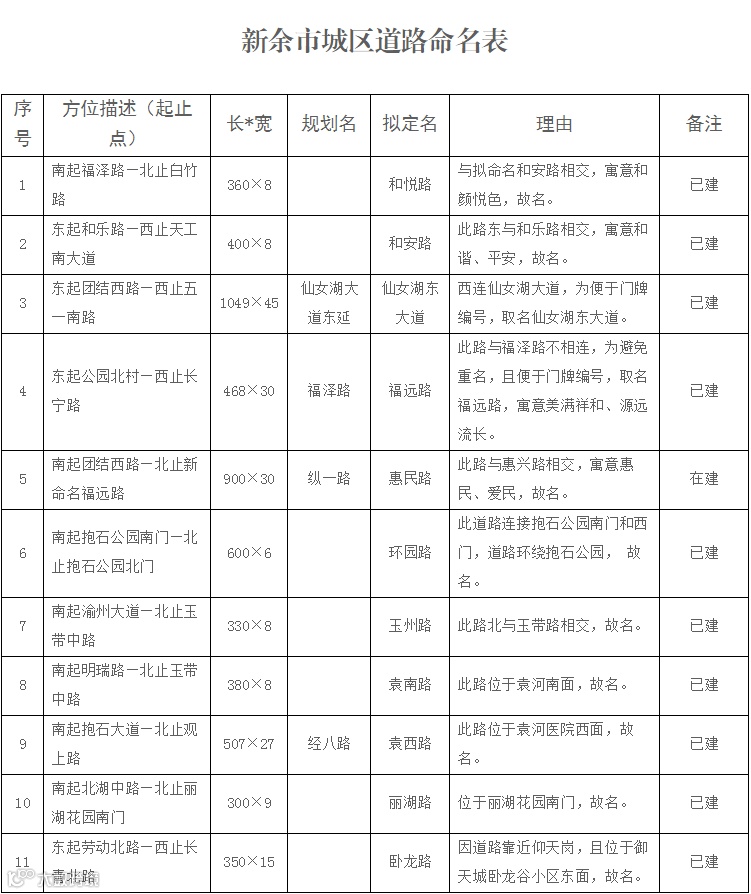 近日,新余市人民政府地名办公室对外发布了一则关于征求《新余市城区新建(改扩建)道路命名方案》的公告,拟对全市16条道路进行命名、5条道路调整起止点,具体如下: