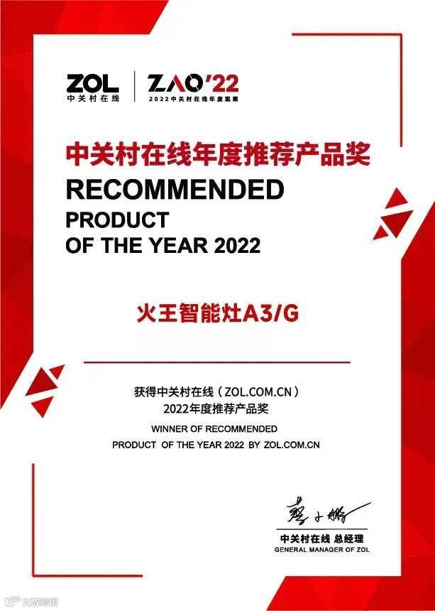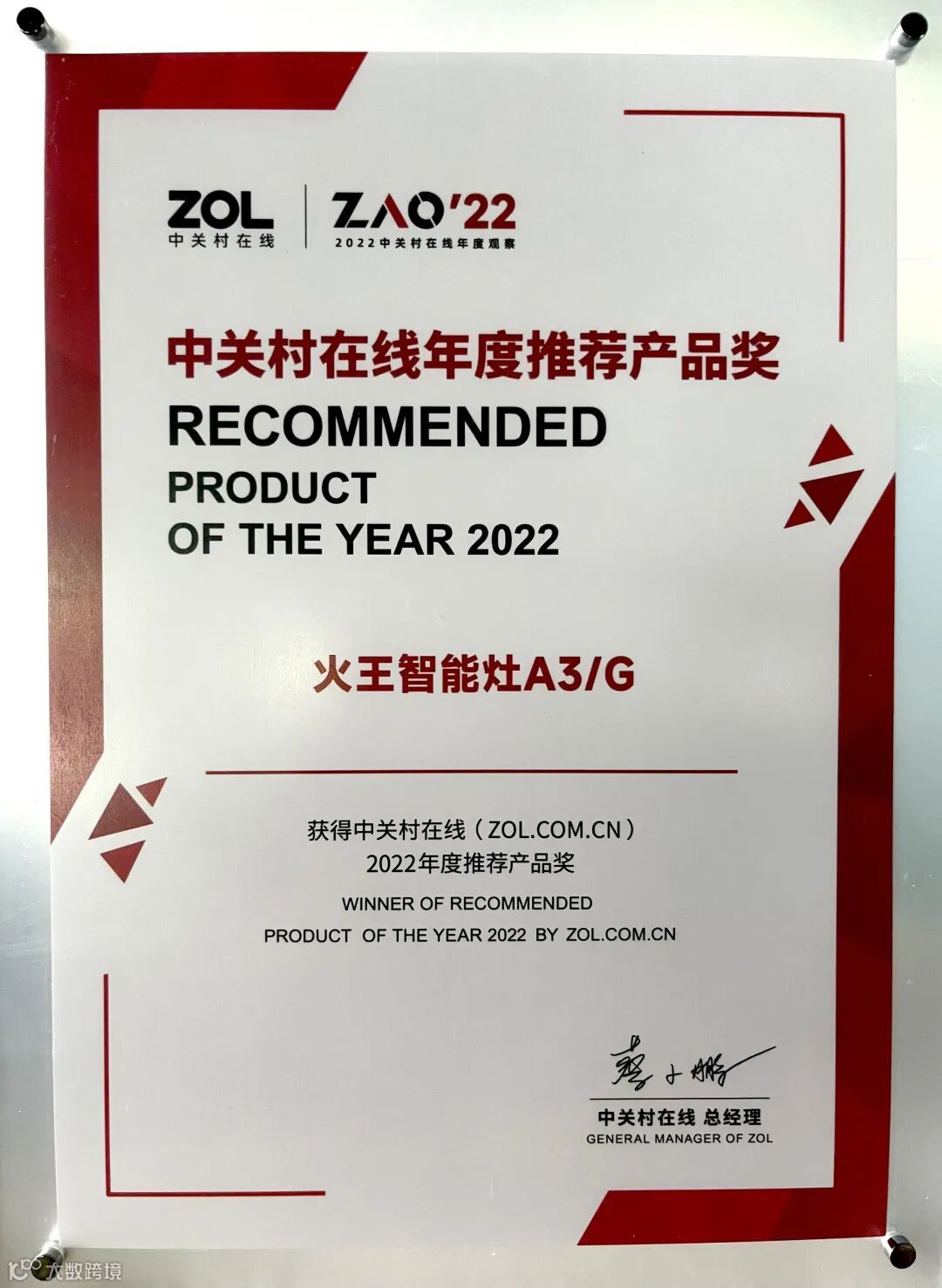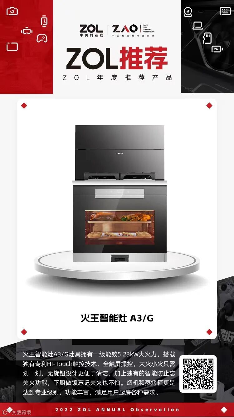 近日,ZAO2022中关村在线年度观察所推选年度优质科技产品的评选榜单正式出炉,火王智能灶的A3/G产品荣获“2022 ZOL年度推荐产品”!