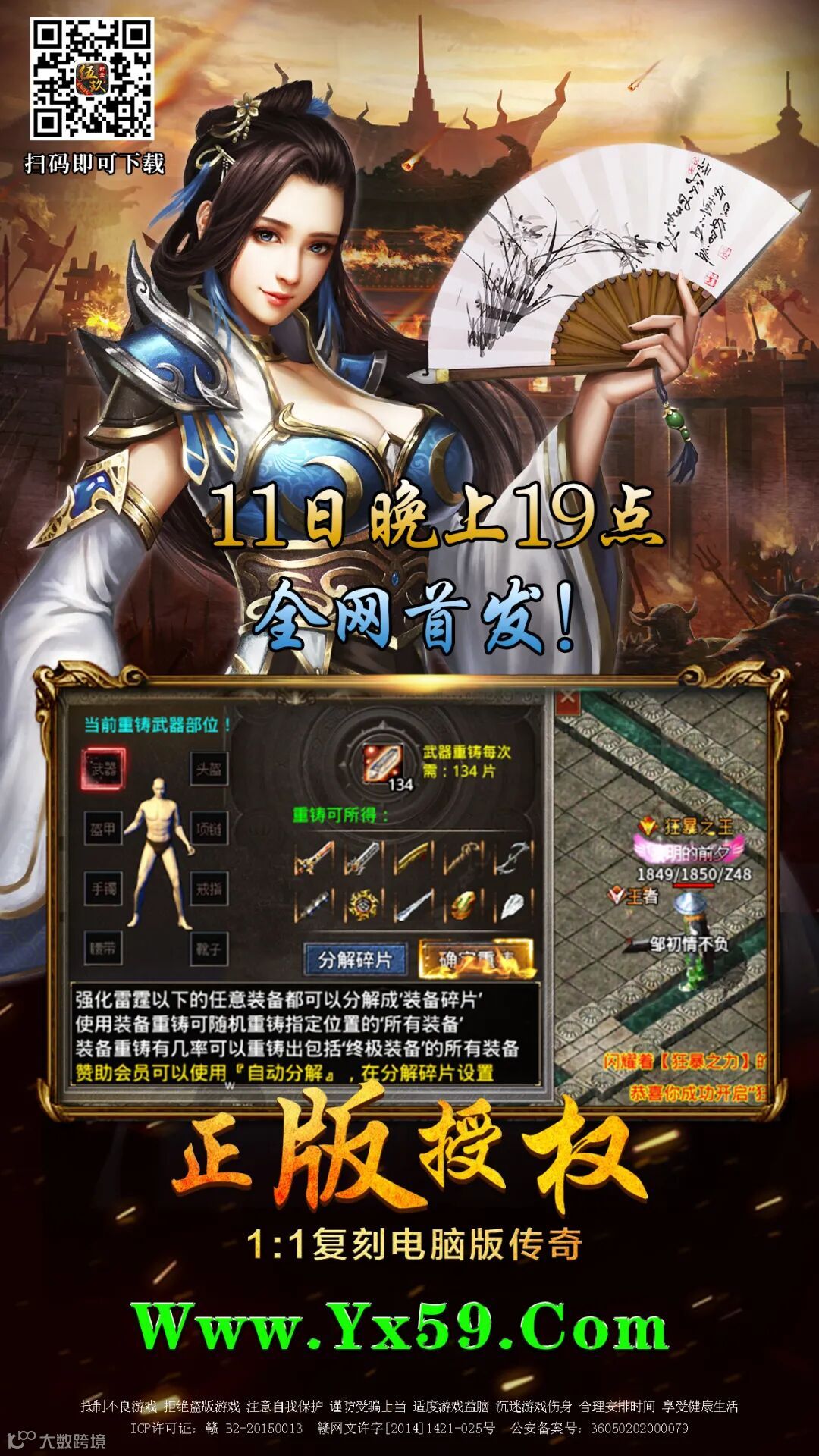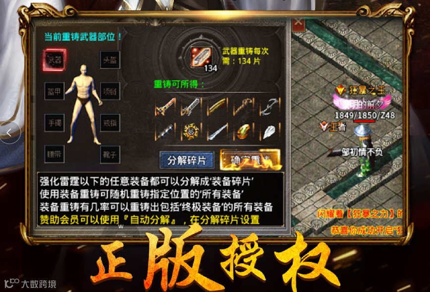 重金配置装备重铸系统(全网手游独一无二),玩家打到的任何装备,都可以在此功能内分解成装备碎片,然后使用装备碎片有几率重铸出本服终极装备,所有装备在这里,散人都有机会获得终极装备!
