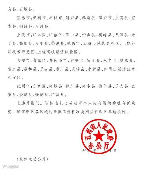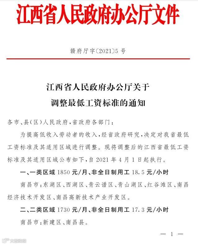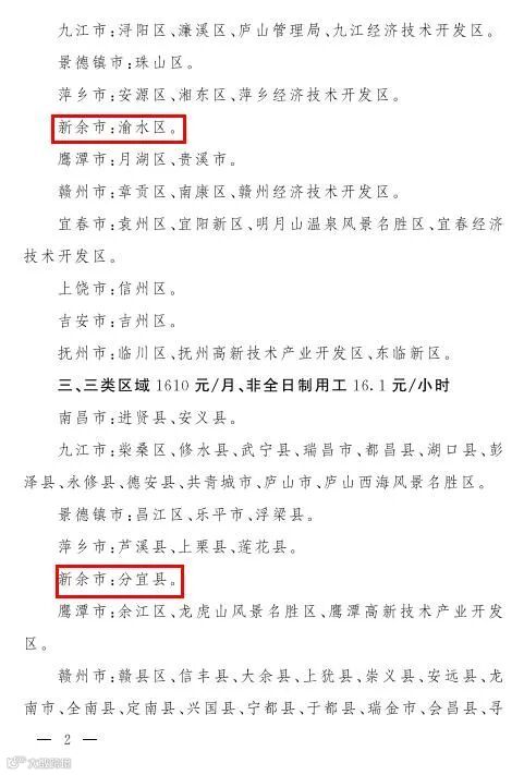 江西已下发《关于调整最低工资标准的通知》决定从2021年4月1日起上调最低工资标准。 根据《通知》,江西省将现行月最低工资标准按三类区域标准执行,渝水区属于二类区域,分宜县属于三类区域,而高新区和仙女湖参照渝水区的二类区域标准执行。即高新区、渝水区、仙女湖区由1580元/月调整为1730元/月,分宜县由1470元/月调整为1610元/月;非全日制用工小时最低工资标准,高新区、渝水区、仙女湖区由15.8元/小时调整为17.3元/小时,分宜县由14.7元/小时调整为16.1元/小时。