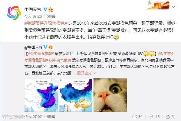 最高级别的寒潮橙色预警