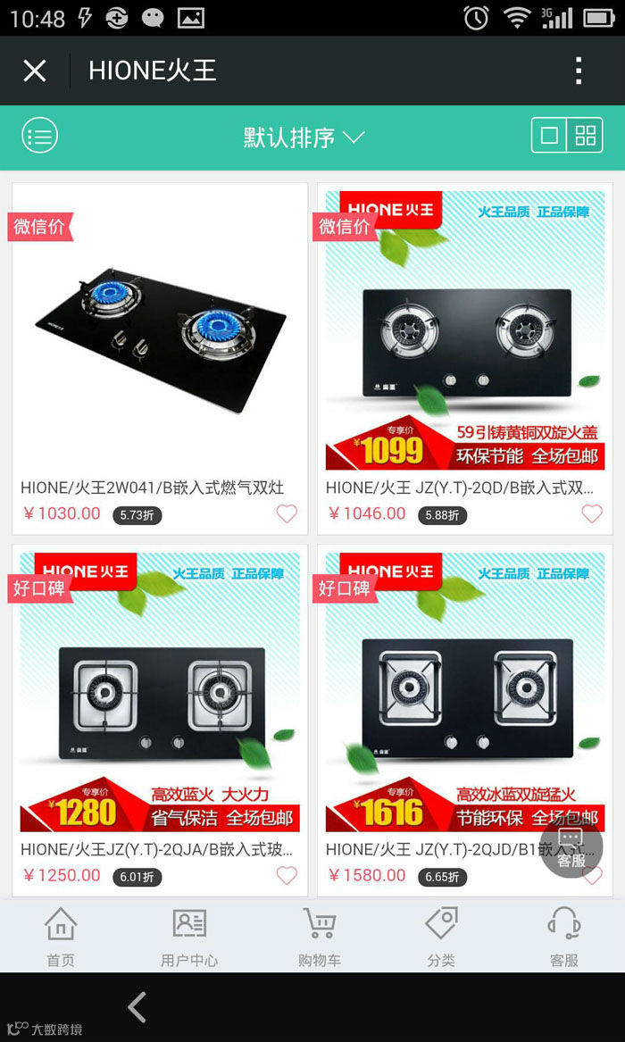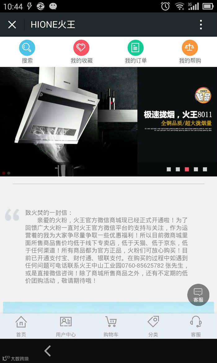 因为微信购物目前还不是主流,所以为了满足喜欢新潮,追求新事物的朋友,那么第二部分就是火王为用户提供的微信购物模块功能,购物模块目前引入的产品型号不是很多,但 是都是精挑细选相对性价很高的。售价的也是低于火王现有的所有渠道,微商城的初衷在于提供更加多元化的体验和服务,在目前微信购物尚未成型的前提下,只是满足少数用户的需求,那同时商场还引入客服系统,用户可随时通过电话和微信,乃至QQ和火王厨电进行购物沟通。目前微商城开通了支付宝支付,财付通支付和银联支付,可根据实际情况选择支付!