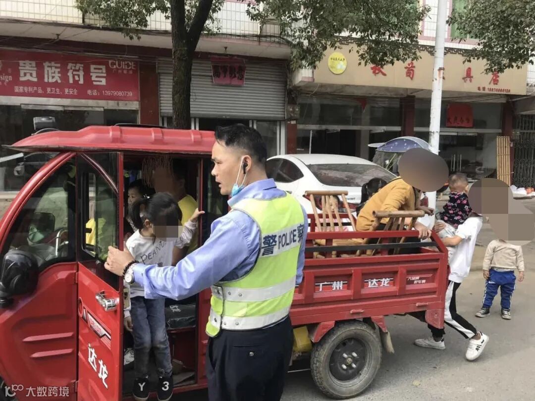 “三轮车只能载货不能载人,载这么多人上路,很容易引发交通事故……”交警一边将车上的小孩抱下车,一边对驾驶员进行严厉批评教育。
