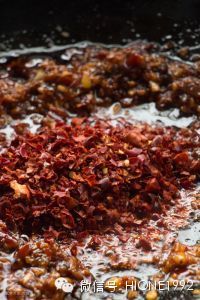 11.另起锅去底油,煸香姜蒜末、豆瓣酱、辣妹子辣椒酱、三耳佐餐宝和辣椒粉