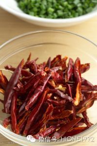 16.在肉片上放上麻椒、花椒、辣椒丝和葱花