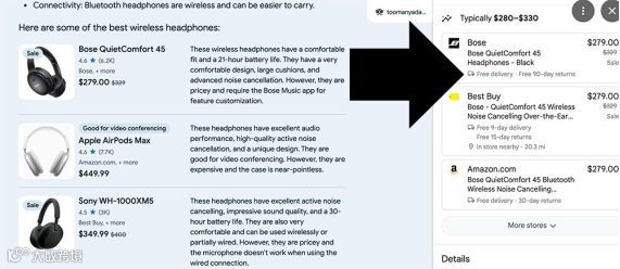 例如,"无线耳机 "的 SGE 最高搜索结果不是链接。点击后会打开一个右侧面板(在台式电脑上),其中包含三个在线商店的链接。