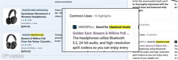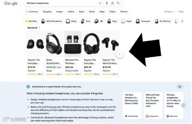 广告会影响自然搜索流量。优秀的广告可以主导搜索结果,甚至是最重要的自然搜索结果。例如,使用 SGE 搜索 "无线耳机 "时,广告排在第一位,人工智能响应排在第二位,常规或传统搜索结果在第三位。