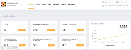 这款分析工具提供了一个统一的仪表盘,其中包含全面的 Instagram 分析洞察,可以帮助你衡量当前的状况和 Instagram 内容的整体表现。