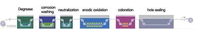 单色、渐变色:抛光/喷砂/拉丝→除油→阳极氧化→中和→染色→封孔→烘干