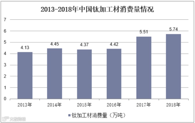 在高端化工、航空航天、船舶和电力等行业需求带动下,近年来我国钛行业需求总体呈现上升趋势,高端钛合金需求不断增加,2018年中国钛加工材消费量为5.74万吨,同比增长4.2%。