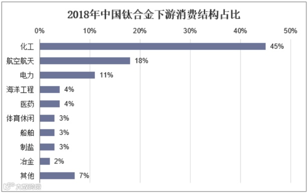 钛合金材料及其铸造技术最开始是为适应航空航天工业的的需要而发展起来的,在全球钛合金消费结构中,航天和工业领域合计占比约90%。在国内钛合金消费结构中,化工行业占比45%,排名第一;航空航天领域占比18%,排名第二;可见我国航空用钛材市场存在很大的消费潜力。