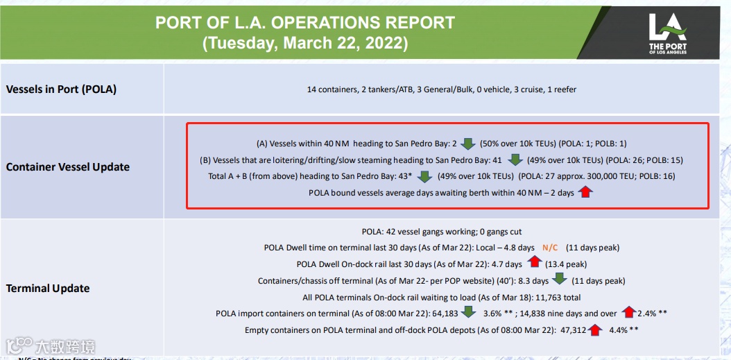 截至当地时间3月22日,LA/LB港口外等待的船舶数量降至41艘。现在等待泊位的平均时间从年初的8天缩减至2天。
