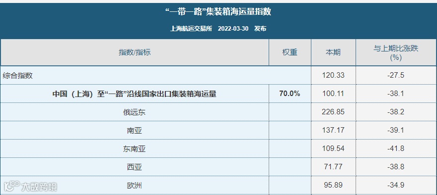 据上海航运交易所3月30日公布的“一带一路”集装箱海运量指数显示,中国(上海)至“一路”沿线国家出口集装箱海运量中,俄远东本期指数为226.85,与上期相比下跌38.2%,欧洲指数为95.89,下跌了34.9%。