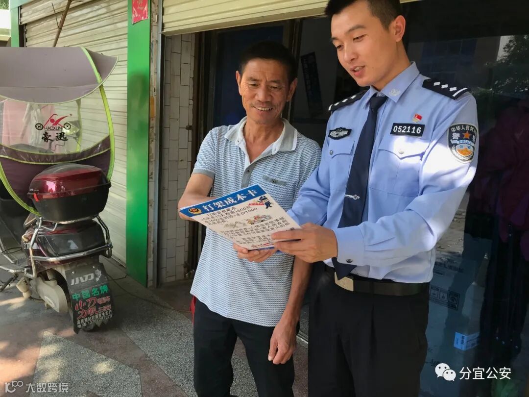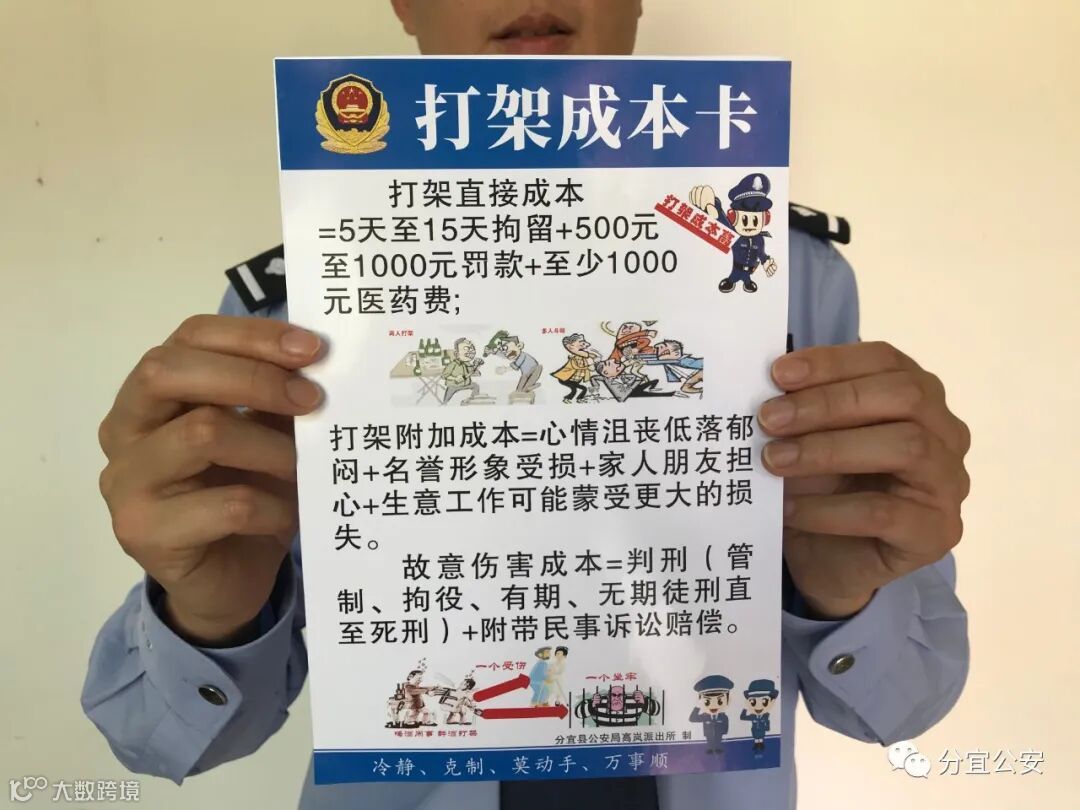 当内心冲动想要打架时,你计算过它的“成本”吗?分宜县公安局高岚派出所将这个问题的答案写在了一张张小卡片上,以公式计算的方式直观的将打架带来的直接成本与附加成本表现出来,这些小卡片发出去后,当地因打架引发的治安案件明显降低,此举深受群众欢迎。