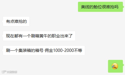 现在美线舱位难抢,甚至出现了一个刷箱黄牛职业,刷一个集装箱的箱号佣金1000-2000不等。
