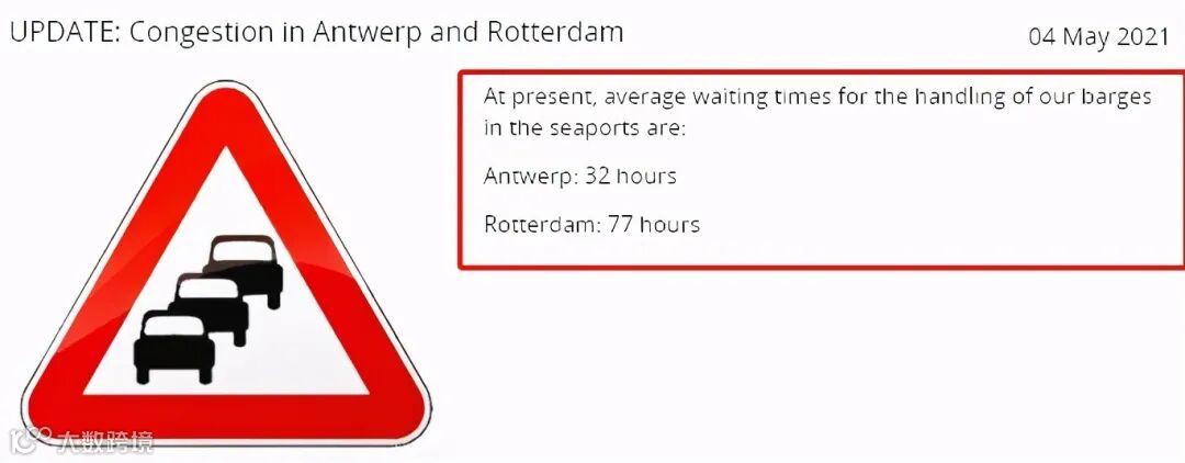 数据显示,近半个月内,鹿特丹驳船码头的等待时间达到77个小时;而安特卫普的拥堵状况有所缓解,但平均仍需等待32个小时;从比利时港口运出的货物,货主仍需等待24小时左右。