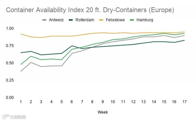 “集装箱可用指数”(CAx)显示,欧洲主要三大港口——荷兰的鹿特丹港、安特卫普港以及德国的汉堡港正见证着蜂拥而至的集装箱。
