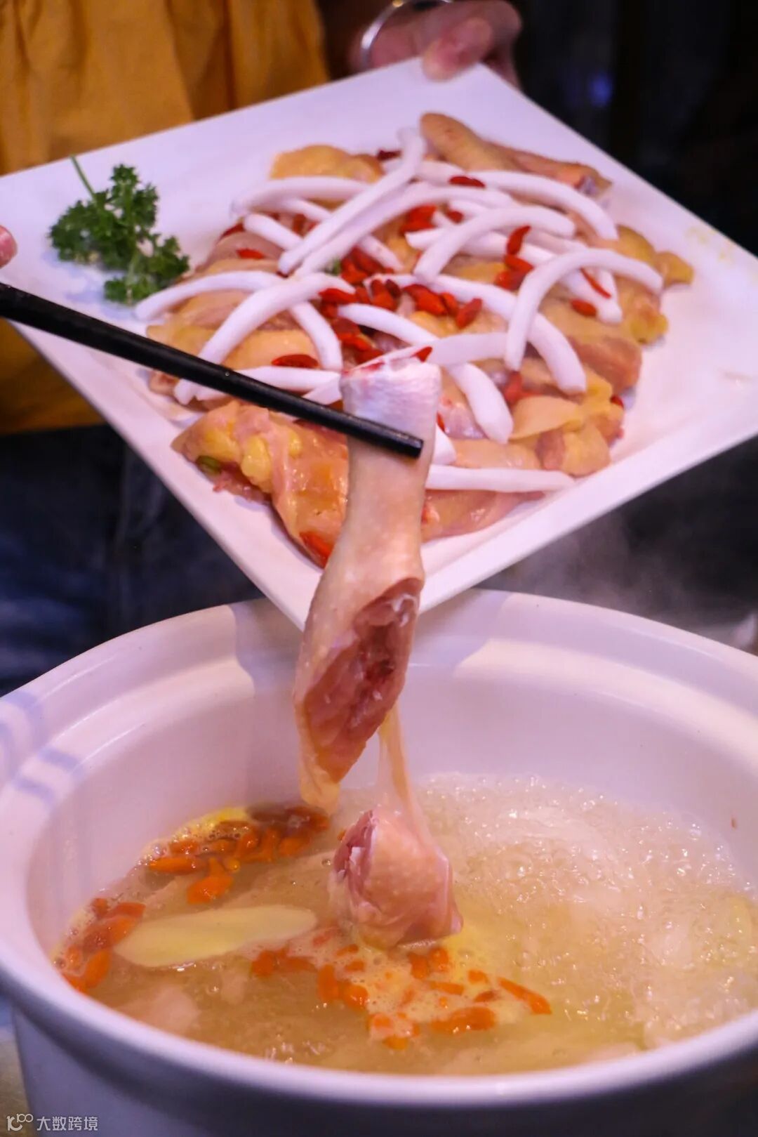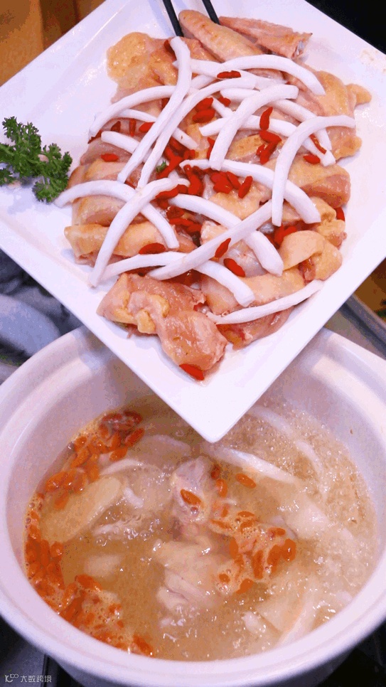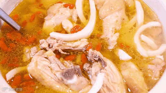 汤底选用新鲜椰子汁熬制而成,配料放有枸杞、生姜、椰子肉,不但去掉了部分油腻,喝起来清爽又养生。