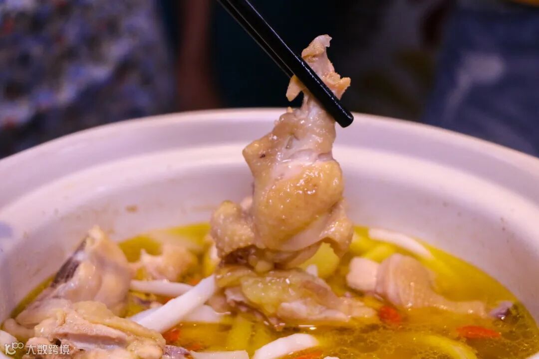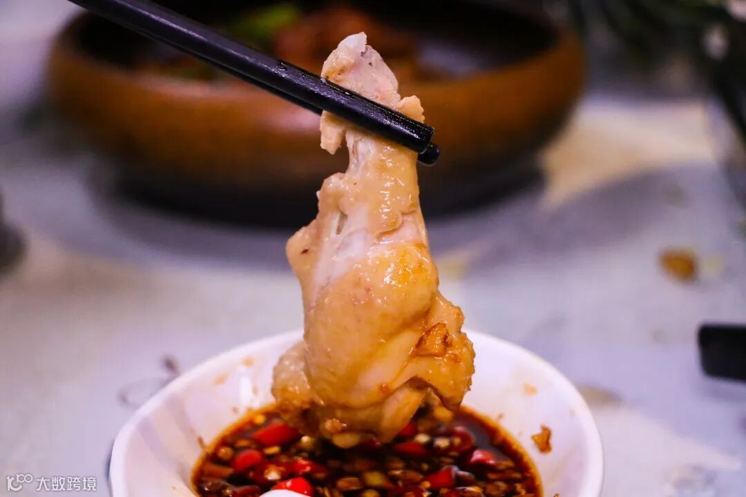 喝完汤就能品尝鸡肉啦!此时的鸡肉最爽滑,配上沙姜、小米椒和海南小青桔调味,鲜香无比。