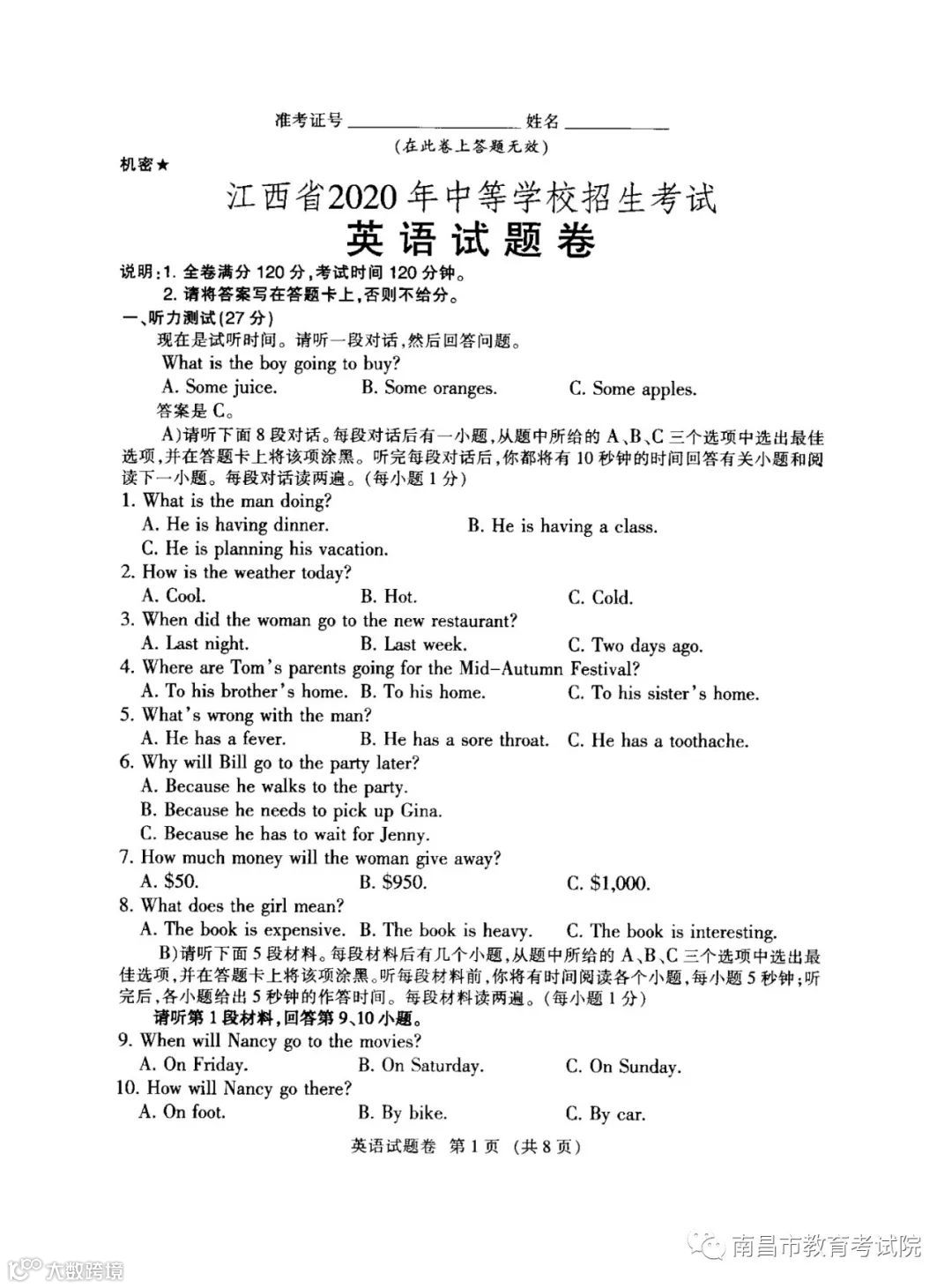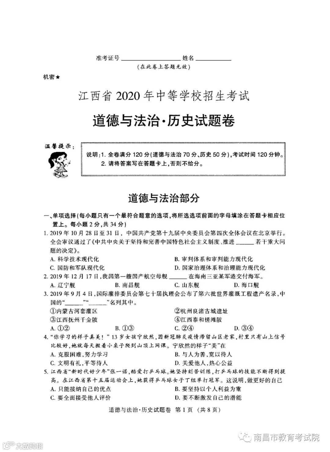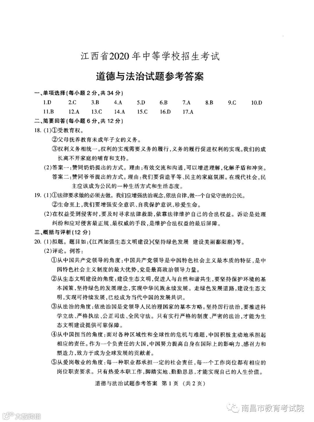(↑扫描上方二维码可下载江西省2020年中考试卷及参考答案)