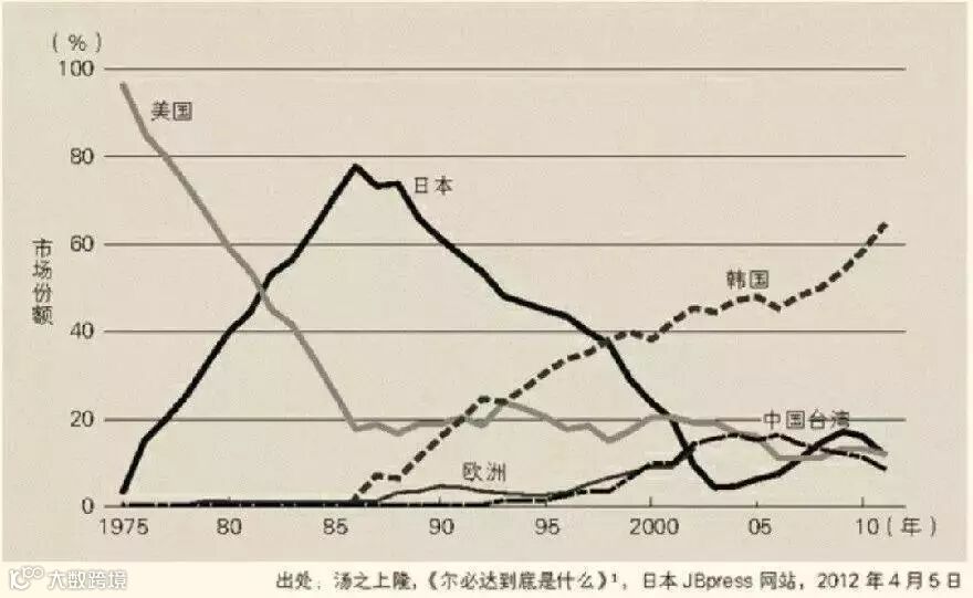 这一战,日本人输得干干净净,从高峰时占据全球近80%的DRAM(俗称电脑内存)份额,跌到现在的零。这场芯片战争完美诠释了什么叫国际政治经济学,亚当.斯密的自由市场竞争理论在大国产业PK中,只是一个美好的童话。
