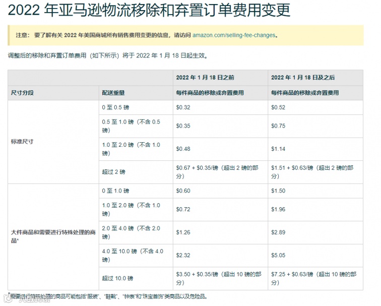 另外,今天亚马逊FBA发布一则公告,宣布调整美国站FBA配送费用,并于2022年1月18日起生效。
