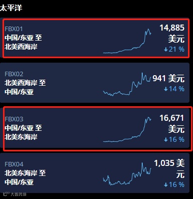 与9月10日最高点相比,美西运价下跌5701美元,跌幅达27.69%;美东运价下跌5498美元,跌幅达24.79%。