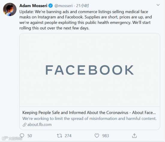 据外媒最新消息,社交网络巨头Facebook上周五宣布暂时禁止发布销售医用口罩的广告。这家社交媒体巨头将在“未来几天”开始强制执行这类广告的临时禁令。