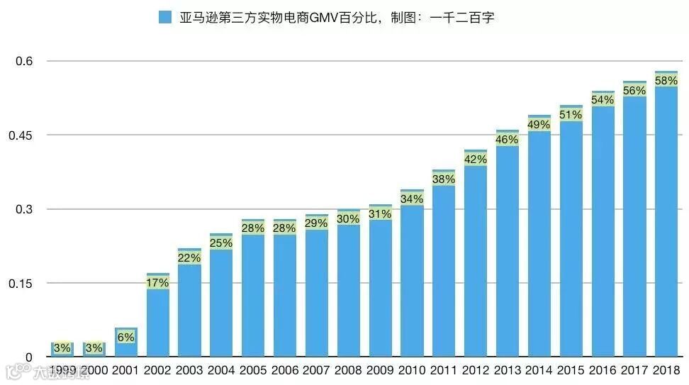 贝索斯在2018致股东信开篇就说,20年来由第三方独立卖家销售的实物商品GMV占比从3%增长到58%,对应GMV从1999年的1亿美元增长到2018年的1600亿美元,年复合增长率CAGR高达52%。
