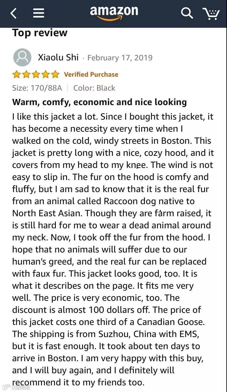 从亚马逊美国的波司登官方销售的评价中随机找到一条(上图),这位波士顿买家对所购男士长款羽绒服质量很满意,价格是“加拿大鹅”的三分之一。但他也指出衣服脖领处的毛是用真实动物狸的毛制成,动物保护者会介意。可见,这些文化与认知上的细节差异需要中国卖家借助评价系统、社交媒体等渠道不断摸索改进。这也是中国制造出海遇到的更复杂的问题。