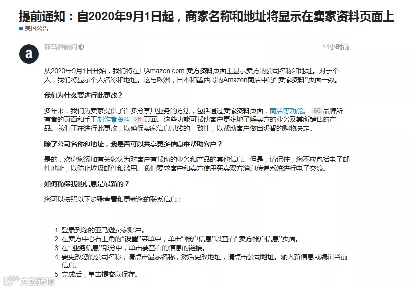 自2020年9月1日开始,商家名称和地址将显示在卖家资料页面上。