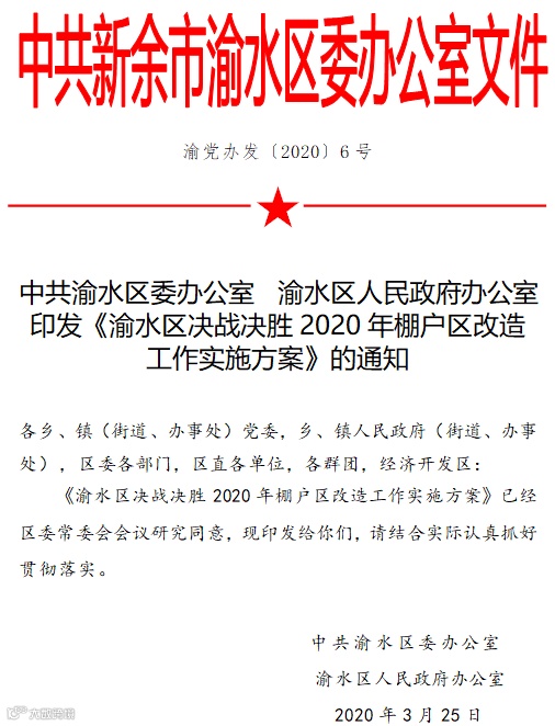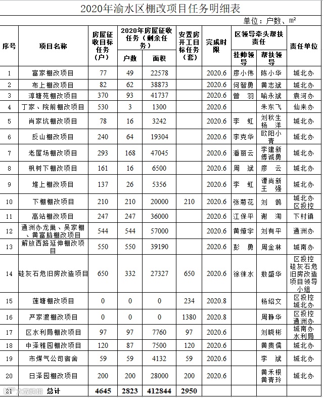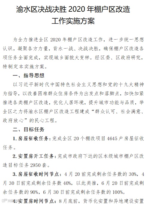 为加快推进全区棚户区改造工作,我区成立了由主要领导挂帅的全区棚改领导小组和棚改指挥部,制定印发了《渝水区决战决胜2020年棚户区改造工作实施方案》,表明了区委、区政府打赢棚改攻坚战的决心和信心。