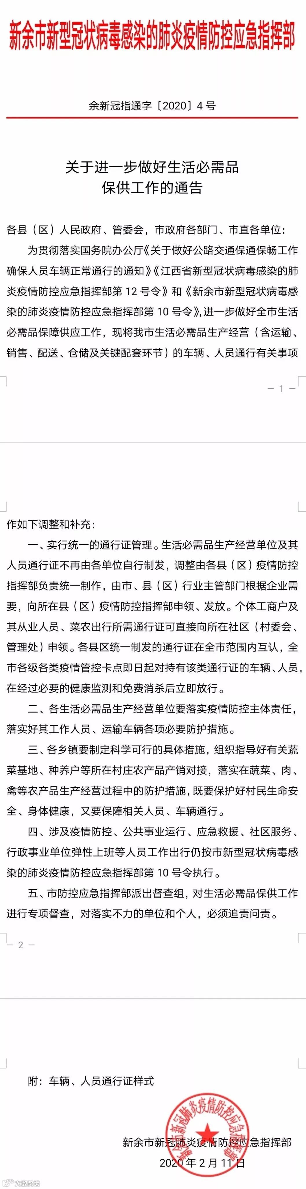 为贯彻落实国务院办公厅《关于做好公路交通保通保畅工作确保人员车辆正常通行的通知》《江西省新型冠状病毒感染的肺炎疫情防控应急指挥部第12号令》和《新余市新型冠状病毒感染的肺炎疫情防控应急指挥部第10号令》,进一步做好全市生活必需品保障供应工作,现将我市生活必需品生产经营(含运输、销售、配送、仓储及关键配套环节)的车辆、人员通行有关事项作如下调整和补充: