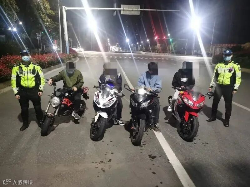 ▲3月20日晚,铁骑队民警在“夜巡”模式中查扣未悬挂号牌非法改装摩托车4辆,4名驾驶员均未成年(在校学生)。经现场了解,4名学生用压岁钱和实习工资购买二手摩托车后相约去“隧道”兜风。