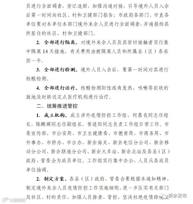 1.全部进行排查。各县(区)要对近期境外来余人员进行进行全面排查,做到一个不漏。同时,要对在境外务工、留学人员进行全面调查,登记造册,加强沟通对接,引导境外人员入余后第一时间向社区、村和卫健部门报告;市政府各部门、市直各单位要对本单位本部门境外来余人员进行全面调查,并通报给其所居住的社区、村和卫健部门。
