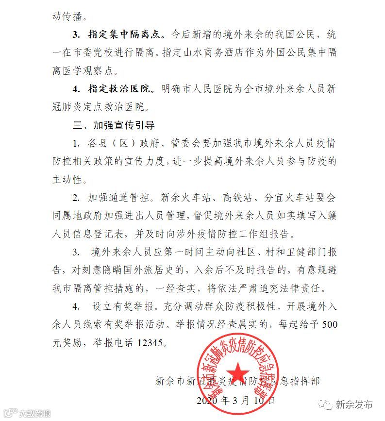 3.指定集中隔离点。今后新增的境外来余的我国公民,统一在市委党校进行隔离。指定山水商务酒店作为外国公民集中隔离医学观察点。