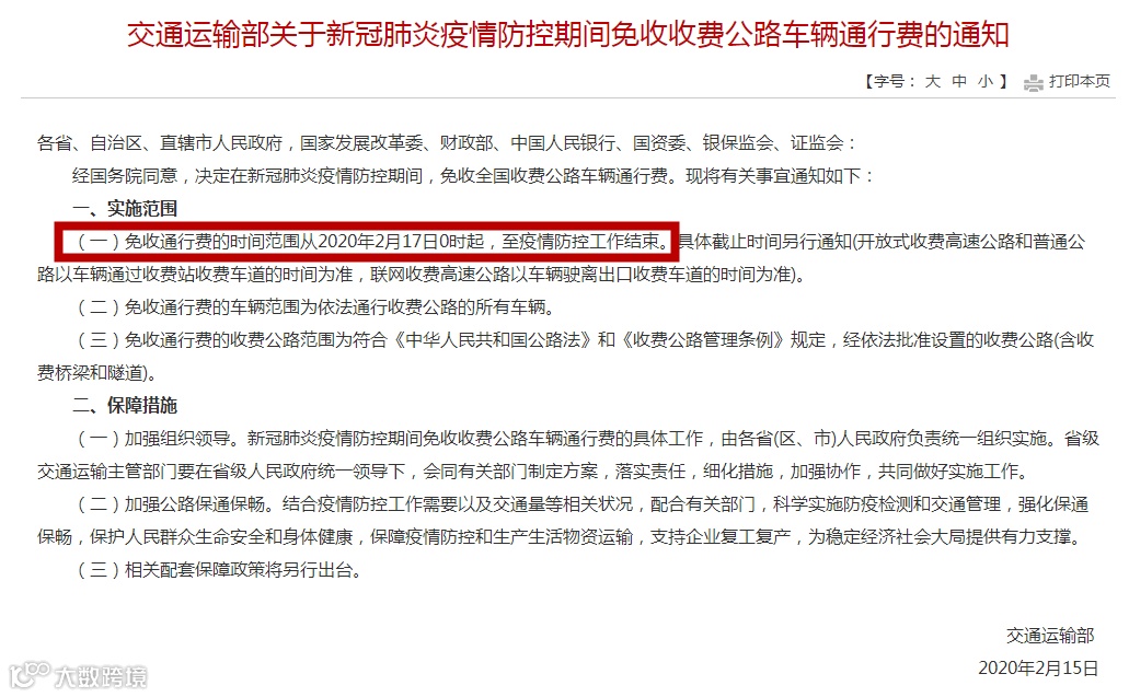 (一)免收通行费的时间范围从2020年2月17日0时起,至疫情防控工作结束。具体截止时间另行通知(开放式收费高速公路和普通公路以车辆通过收费站收费车道的时间为准,联网收费高速公路以车辆驶离出口收费车道的时间为准)。