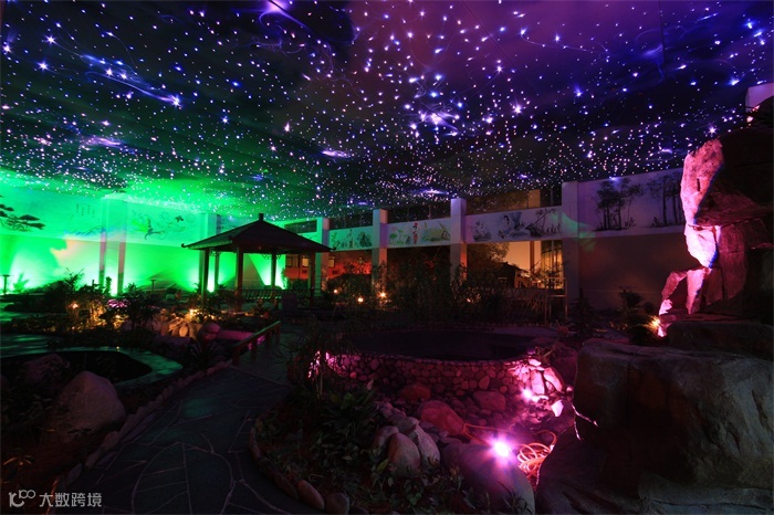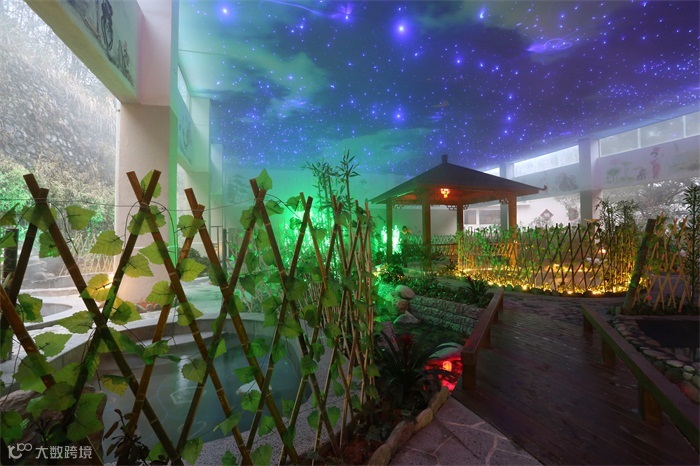 五悦温泉以山水田园的简洁风格为主,不张扬也不造作,木亭、篱笆、青竹、小屋,“有良田美池桑竹之属”的画境之感;置身山水田园,尘虑尽涤,俗念顿消。温泉中还有独特的人造星空,每当夜幕降临,灯光闪亮,温泉池印着“星空”的倒影,点点繁星落于池中,旁边就是乡村小屋,我们可以躺在池边的休闲椅上或享受着温泉之浴。