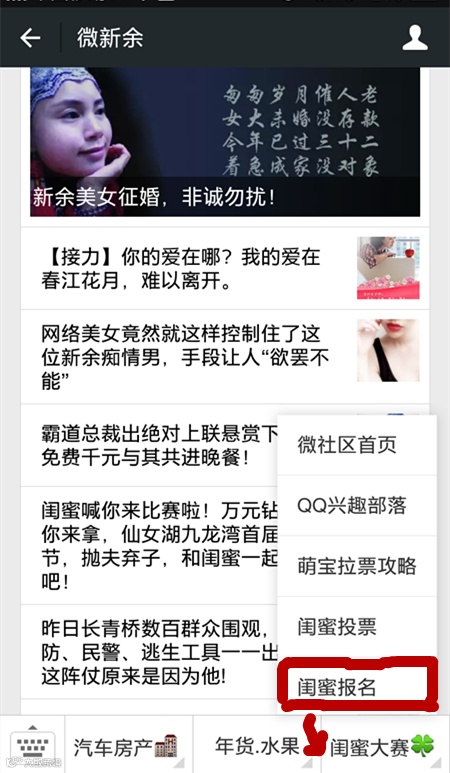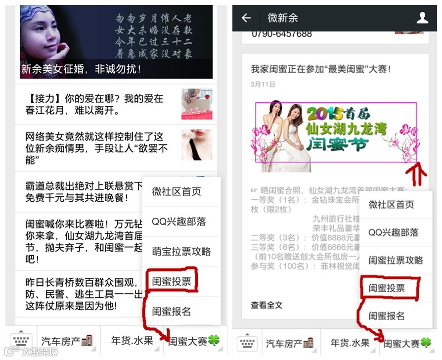 报名方式:关注“微新余”微信公众台,点击微信右下角”闺蜜大赛-闺蜜报名”,按要求发送报名资料