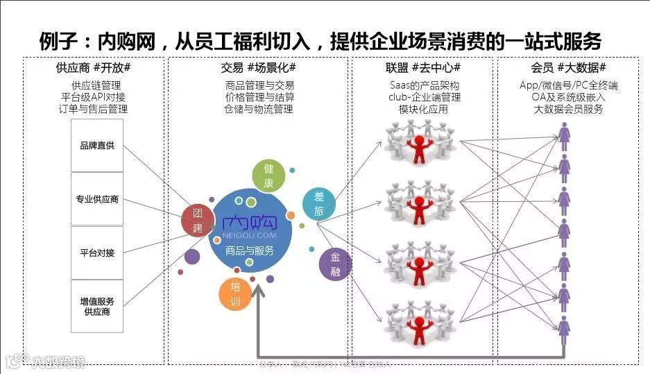 其次,移动互联网场景下的易流转商品的品类更加符合直销特征,更加适合社群或微信等应用场景与消费决策的特征。我发现在消费升级大背景下,企业的消费也在升级,所以我创办了内购网,它把企业结成一个会员联盟体,以员工福利为切入点,一站式满足企业场景消费的商品需求与更高效、更满意的服务。