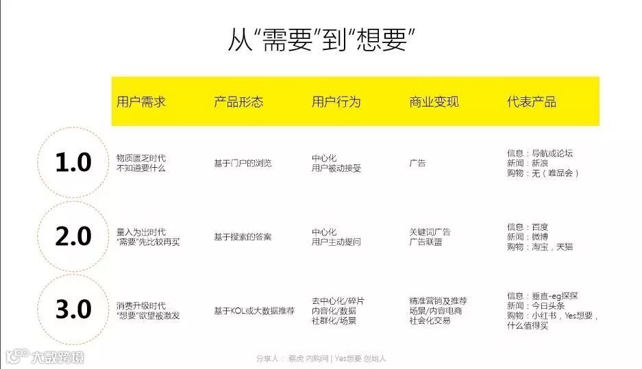 在由传统的PC时代到移动时代的过渡,购物按照从需要到想要的趋势的发展,“需要”时代,用户通过关键词搜索来表达,能提供答案的平台成为用户入口;而在“想要”时代,主逻辑是你有没有能力在用户表达“需要”之前,或者用户还没有意识到“需要”的时候,就发现并推荐他的“想要”,基于KOL或大数据的推荐机制成为主流,而用户行为也从搜索迅速转移到去中心、内容、社群化的碎片化场景,数据替代信息成为新的驱动力。