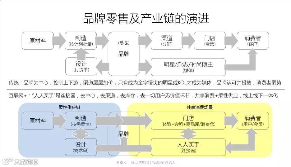 他们熟悉品牌,熟悉门店,熟悉用户,越来越多用户的购物决策依赖于他们的推荐,“人人买手”的时代正在到来,他们正在成为连接器,连接门店和消费者,连接消费者和品牌,甚至连接消费者和设计师;另一端是供应端,按需柔性生产(C2B)是必然的发展趋势,对于所有的制造型企业特别是个性化品类的制造型企业尤其重要。