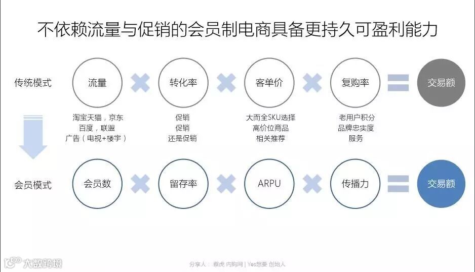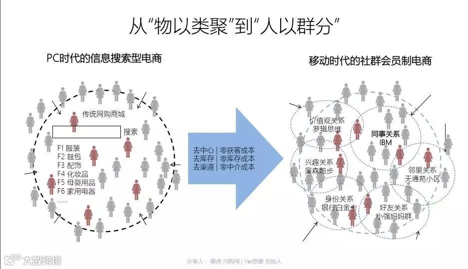 而移动时代,社群特征明显,以社群会员制为导向的电商模型则可以有效降低用户获取成本,甚至为零,还可以做到尽可能从用户需求点出发组织货品,所谓C2B,消除库存压力,也很可能不需要渠道,直接对接品牌,大幅降低渠道成本,甚至完全直销。
